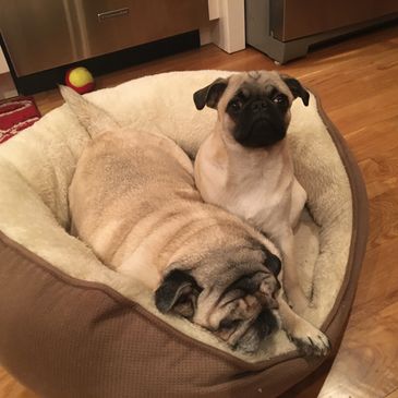 Rose Bud and Hazel, our dedicated and loyal Office Security and Brand Mascot Pugs tirelessly watch over the office and remain steady in their work efforts under Brian's desk.